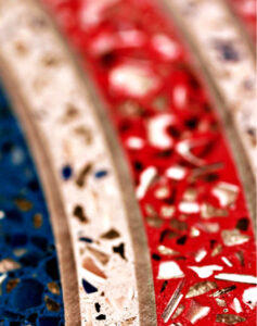 Το Terrazzo συνδυάζει ρητίνες με χρωματιστό μάρμαρο, ρινίσματα γρανίτη ή άλλα εγκεκριμένα αδρανή σε ένα σύστημα δαπέδου με σπάτουλα.